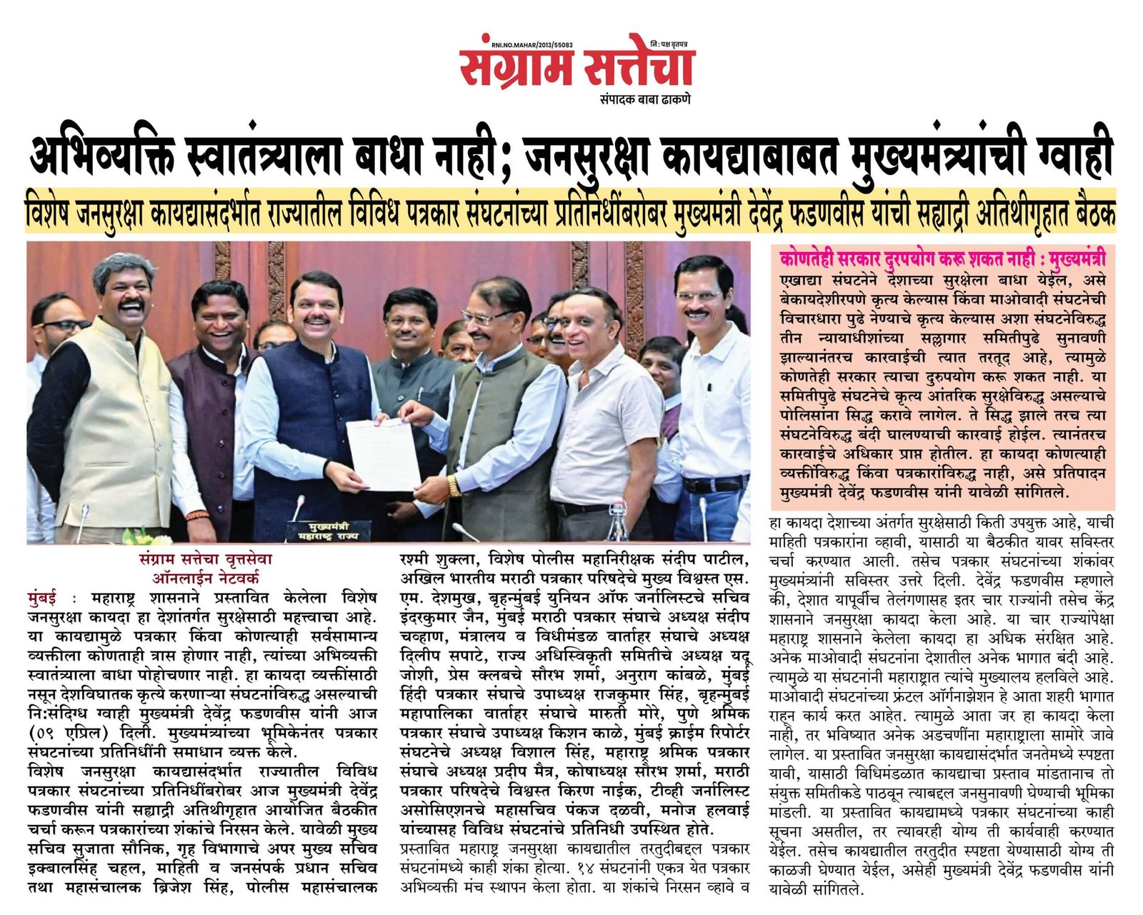 प्रस्तावित महाराष्ट्र जनसुरक्षा कायद्यातील तरतुदीबद्दल पत्रकार संघटनांमध्ये काही शंका होत्या. 14 संघटनांनी एकत्र येत पत्रकार अभिव्यक्ती मंच स्थापन केला होता. या शंकांचे निरसन व्हावे व हा कायदा देशाच्या अंतर्गत सुरक्षेसाठी किती उपयुक्त आहे, याची माहिती पत्रकारांना व्हावी, यासाठी या बैठकीत यावर सविस्तर चर्चा करण्यात आली. तसेच पत्रकार संघटनांच्या शंकांवर मुख्यमंत्र्यांनी सविस्तर उत्तरे दिली. देवेंद्र फडणवीस म्हणाले की, देशात यापूर्वीच तेलंगणासह इतर चार राज्यांनी तसेच केंद्र शासनाने जनसुरक्षा कायदा केला आहे. या चार राज्यांपेक्षा महाराष्ट्र शासनाने केलेला कायदा हा अधिक संरक्षित आहे. अनेक माओवादी संघटनांना देशातील अनेक भागात बंदी आहे. त्यामुळे या संघटनांनी महाराष्ट्रात त्यांचे मुख्यालय हलविले आहे. माओवादी संघटनांच्या फ्रंटल ऑर्गनाझेशन हे आता शहरी भागात राहून कार्य करत आहेत. त्यामुळे आता जर हा कायदा केला नाही, तर भविष्यात अनेक अडचणींना महाराष्ट्राला सामोरे जावे लागेल. या प्रस्तावित जनसुरक्षा कायद्यासंदर्भात जनतेमध्ये स्पष्टता यावी, यासाठी विधिमंडळात कायद्याचा प्रस्ताव मांडतानाच तो संयुक्त समितीकडे पाठवून त्याबद्दल जनसुनावणी घेण्याची भूमिका मांडली. या प्रस्तावित कायद्यामध्ये पत्रकार संघटनांच्या काही सूचना असतील, तर त्यावरही योग्य ती कार्यवाही करण्यात येईल. तसेच कायद्यातील तरतुदीत स्पष्टता येण्यासाठी योग्य ती काळजी घेण्यात येईल, असेही मुख्यमंत्री देवेंद्र फडणवीस यांनी यावेळी सांगितले.