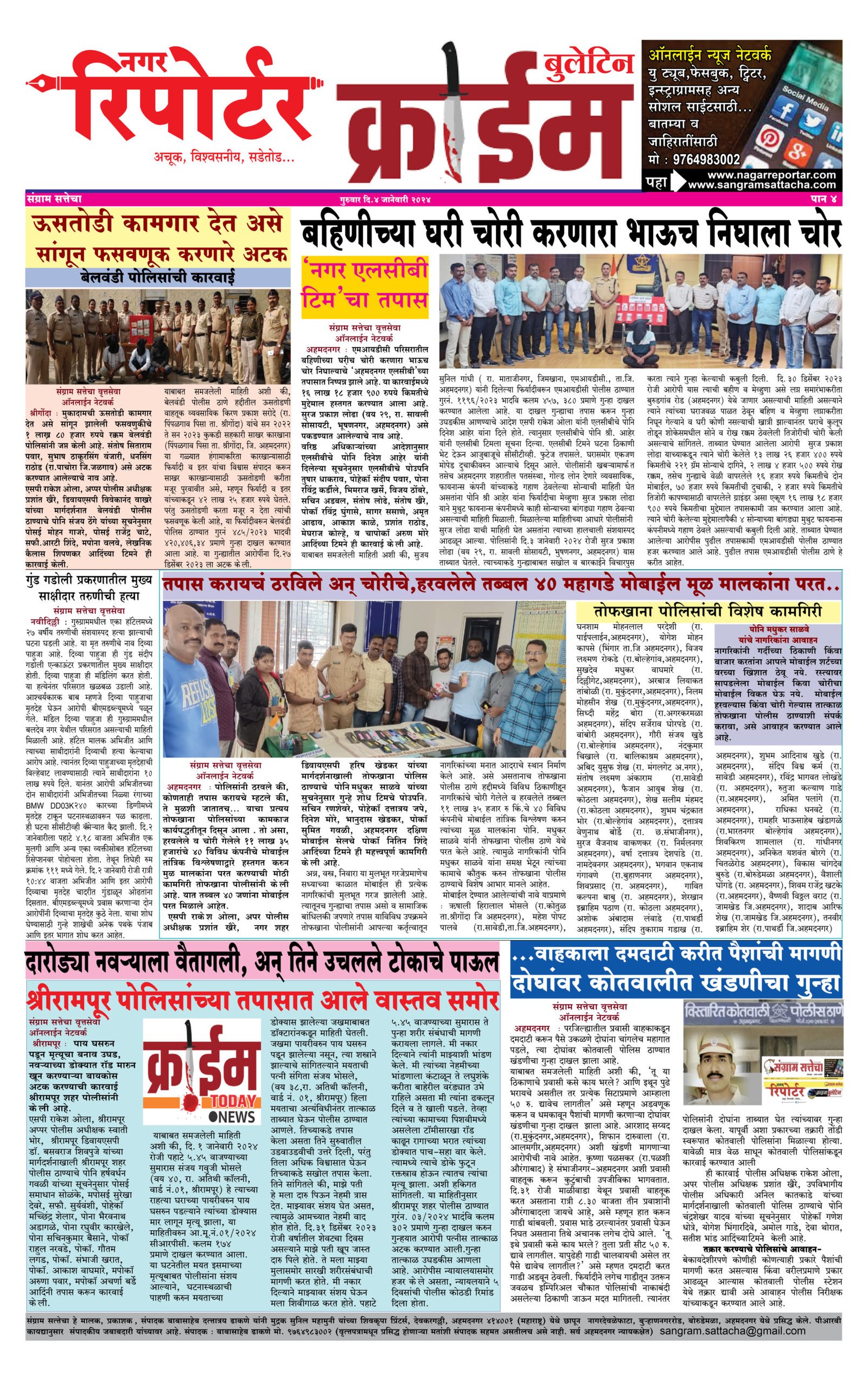 Homeक्राईम क्राईम क्राईम बुलिटिन By baba dhakane 04/01/2024 0 103 WhatsAppFacebookTwitterTelegramPinterestLinkedinReddItTumblrDigg Share WhatsAppFacebookTwitterTelegramPinterestLinkedinReddItTumblrDigg Previous articleसंग्राम सत्तेचा वृत्तसेवाNext articleशासकीय वाळू चोरून वाहतूक करणाऱ्या वाहनांसह १५ लाख ६० हजार रु. किं. मुद्देमाल ताब्यात ; ‘नगर एलसीबी’ कारवाई baba dhakanehttps://sangramsattacha.in Related Articles महाराष्ट्र कोपरगावातील नरभक्षक बिबट्या अखेर ठार, 15 दिवसांत घेतलेला दोघांचा जीव अहमदनगर जिल्हा बुऱ्हाणनगर येथे माजीमंत्री आमदार शिवाजीराव कर्डिले यांचा शोकाकुल वातावरणात दशक्रियाविधी अहमदनगर जिल्हा मंत्री कोकाटेकडून कर्डीले कुटुंबीयांचे सांत्वन LEAVE A REPLY Cancel reply Comment: Please enter your comment! Name:* Please enter your name here Email:* You have entered an incorrect email address! Please enter your email address here Website: Save my name, email, and website in this browser for the next time I comment. Δ Stay Connected0FansLike3,912FollowersFollow22,800SubscribersSubscribe - Advertisement - Latest Articles महाराष्ट्र कोपरगावातील नरभक्षक बिबट्या अखेर ठार, 15 दिवसांत घेतलेला दोघांचा जीव अहमदनगर जिल्हा बुऱ्हाणनगर येथे माजीमंत्री आमदार शिवाजीराव कर्डिले यांचा शोकाकुल वातावरणात दशक्रियाविधी अहमदनगर जिल्हा मंत्री कोकाटेकडून कर्डीले कुटुंबीयांचे सांत्वन महाराष्ट्र केंद्रीय गृहमंत्री अमित शाह यांनी घेतले श्री साईबाबा समाधीचे दर्शन क्राईम Load more