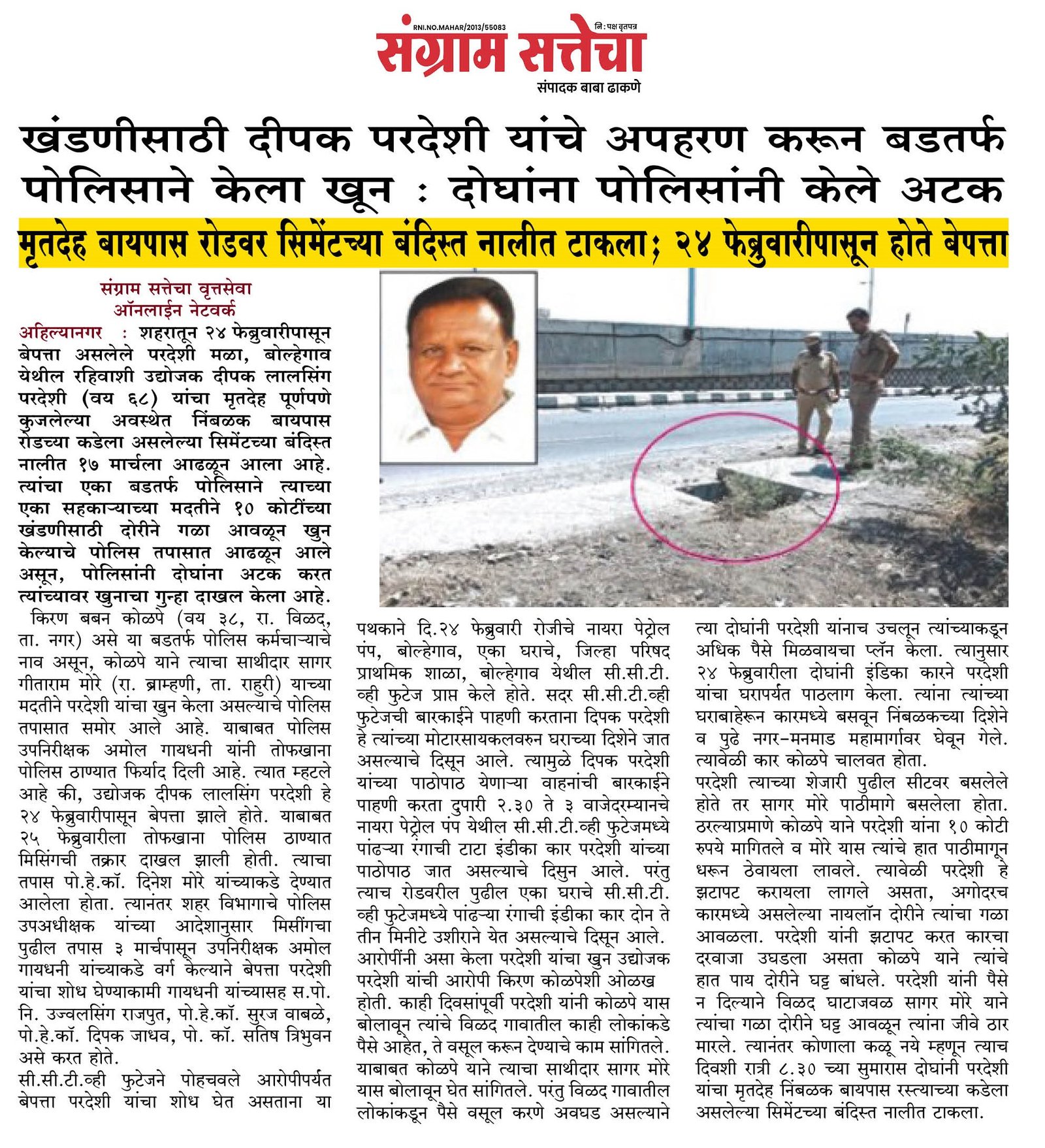 अहिल्यानगर ः शहरातून 24 फेब्रुवारीपासून बेपत्ता असलेले परदेशी मळा, बोल्हेगाव येथील रहिवाशी उद्योजक दीपक लालसिंग परदेशी (वय 68) यांचा मृतदेह पूर्णपणे कुजलेल्या अवस्थेत निंबळक बायपास रोडच्या कडेला असलेल्या सिमेंटच्या बंदिस्त नालीत 17 मार्चला आढळून आला आहे. त्यांचा एका बडतर्फ पोलिसाने त्याच्या एका सहकार्‍याच्या मदतीने 10 कोटींच्या खंडणीसाठी दोरीने गळा आवळून खुन केल्याचे पोलिस तपासात आढळून आले असून, पोलिसांनी दोघांना अटक करत त्यांच्यावर खुनाचा गुन्हा दाखल केला आहे.