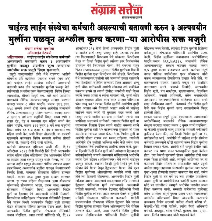 अहिल्यानगर ः चाईल्ड लाईन संस्थेच्या कर्मचारी असल्याची बतावणी करुन 3 अल्पवयीन मुलींना पळवून अश्लील कृत्य करणार्या आरोपीस सक्त मजुरी शिक्षा सुनावली. राहुरी तालुक्यातील उंबरे येथे राहणारा आरोपी सोमनाथ उर्फ ऋषीकेश एकनाथ हापसे (वय 32) याने चाईल्ड लाईन संस्थेचा कर्मचारी असल्याची बतावणी करुन तीन अल्पवयीन मुलींना पळवून नेले. त्यांच्याशी अश्लील कृत्य केल्याप्रकरणी विशेष जिल्हा न्यायाधीश, श्रीमती माथुरी एच. मोरे यांनी आरोपीस बालकांचे लैंगिक अत्याचारापासून संरक्षण करणारा कायदा कलम 8 तसेच भादवि. कलम 363,366, 354 अन्वये अन्वये दोषी धरून आरोपीस बालकांचे लैंगिक अत्याचारापासून संरक्षण करणारा कायदा कलम 8 नुसार 4 वर्ष सक्त मजुरीची शिक्षा, रक्कम रुपये 3 हजार दंड, दंड न भरल्यास एक महिना साधी कैद तसेच भादवि. कलम 366 नुसार 3 वर्षे सक्त मजुरीची शिक्षा तसेच दंड रु.3 हजार रु. दंड न भरल्यास एक महिना साथी कैद अशी शिक्षा ठोठावली. या प्रकरणी खटल्याचे कामकाज विशेष सरकारी वकील श्रीमती मनिषा पी. केळगंद्रे-शिंदे यांनी पाहिले.