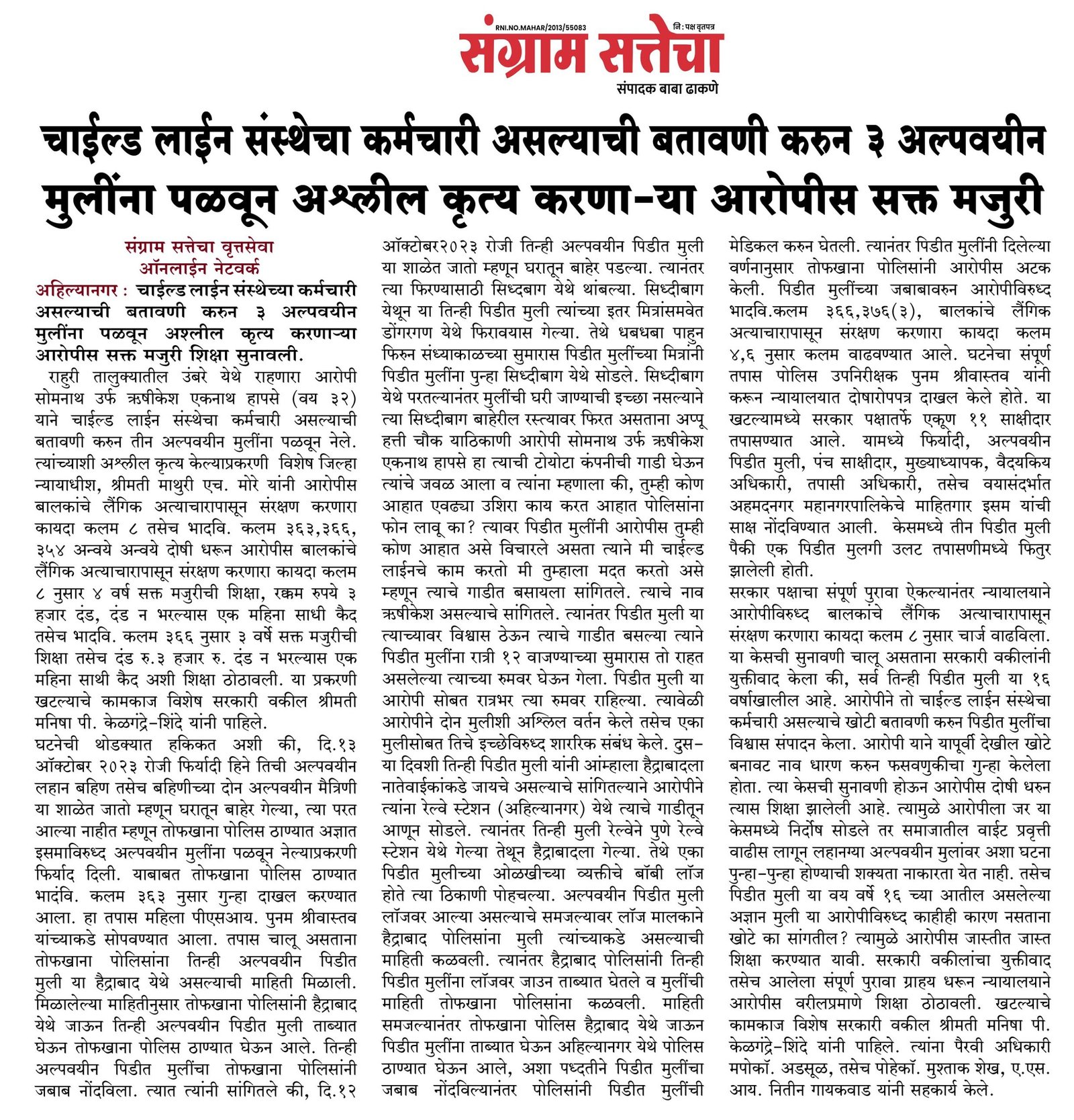 सरकार पक्षाचा संपूर्ण पुरावा ऐकल्यानंतर न्यायालयाने आरोपीविरुध्द बालकांचे लैंगिक अत्याचारापासून संरक्षण करणारा कायदा कलम 8 नुसार चार्ज वाढविला. या केसची सुनावणी चालू असताना सरकारी वकीलांनी युक्तीवाद केला की, सर्व तिन्ही पिडीत मुली या 16 वर्षाखालील आहे. आरोपीने तो चाईल्ड लाईन संस्थेचा कर्मचारी असल्याचे खोटी बतावणी करुन पिडीत मुलींचा विश्वास संपादन केला. आरोपी याने यापूर्वी देखील खोटे बनावट नाव धारण करुन फसवणुकीचा गुन्हा केलेला होता. त्या केसची सुनावणी होऊन आरोपीस दोषी धरुन त्यास शिक्षा झालेली आहे. त्यामुळे आरोपीला जर या केसमध्ये निर्दोष सोडले तर समाजातील वाईट प्रवृत्ती वाढीस लागून लहानग्या अल्पवयीन मुलांवर अशा घटना पुन्हा-पुन्हा होण्याची शक्यता नाकारता येत नाही. तसेच पिडीत मुली या वय वर्षे 16 च्या आतील असलेल्या अज्ञान मुली या आरोपीविरुध्द काहीही कारण नसताना खोटे का सांगतील? त्यामुळे आरोपीस जास्तीत जास्त शिक्षा करण्यात यावी. सरकारी वकीलांचा युक्तीवाद तसेच आलेला संपूर्ण पुरावा ग्राहय धरून न्यायालयाने आरोपीस वरीलप्रमाणे शिक्षा ठोठावली. खटल्याचे कामकाज विशेष सरकारी वकील श्रीमती मनिषा पी. केळगंद्रे-शिंदे यांनी पाहिले. त्यांना पैरवी अधिकारी मपोकॉ. अडसूळ, तसेच पोहेकॉ. मुश्ताक शेख, ए.एस.आय. नितीन गायकवाड यांनी सहकार्य केले.