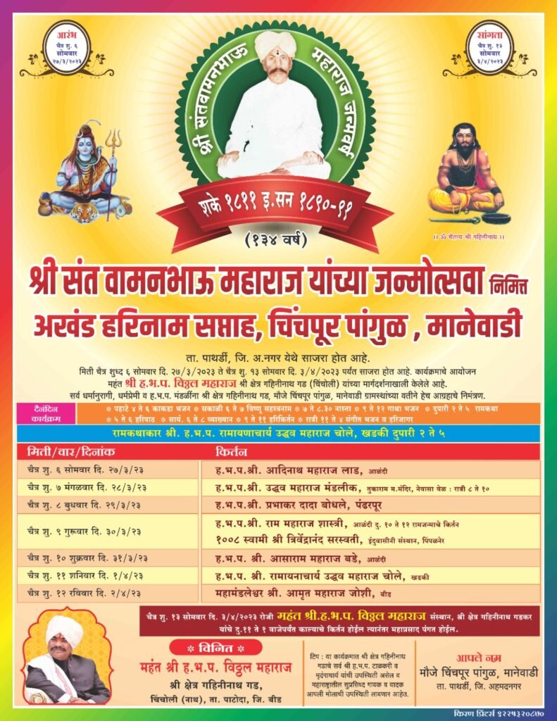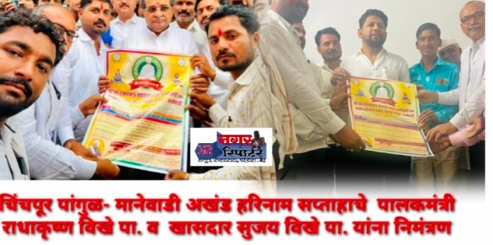 पाथर्डी – अहमदनगर जिल्ह्यातील पाथर्डी तालुक्यातील चिंचपूर पांगुळ- मानेवाडी येथील श्री वामनभाऊ महाराजांच्या जन्मोत्सवानिमित्ताने अखंड हरिनाम सप्ताहाचे निमंत्रण महसुल मंत्री तथा नगरचे पालकमंत्री राधाकृष्ण विखे पाटील व दक्षिण नगरचे खासदार सुजय विखे पाटील यांना शनीवारी (दि.१८) चिंचपूर पांगुळ येथील श्री वामनभाऊ महाराजांच्या अखंड हरिनाम सप्ताह कमिटीच्या वतीने नगर येथे भेटून देण्यात आले. यावेळी निमंत्रण देताना भाजप जिल्हा उपाध्यक्ष तथा युवानेते धनंजय बडे,मानेवाडी सेवा.सोसायटीचे चेअरमन अशोक बडे, मा. उपसरपंच शिवाजी बडे, अशोक बारगजे, मा.उपसरपंच आजीनाथ बडे, संपत दरेकर,धोंडिबा धायतडक, सोमनाथ बडे,दत्तू नागरगोजे, सोनाजी बडे, प्रकाश बडे,केशव बडे,विशाल धायतडक,आदिंसह ग्रामस्थ यावेळी उपस्थित होते.