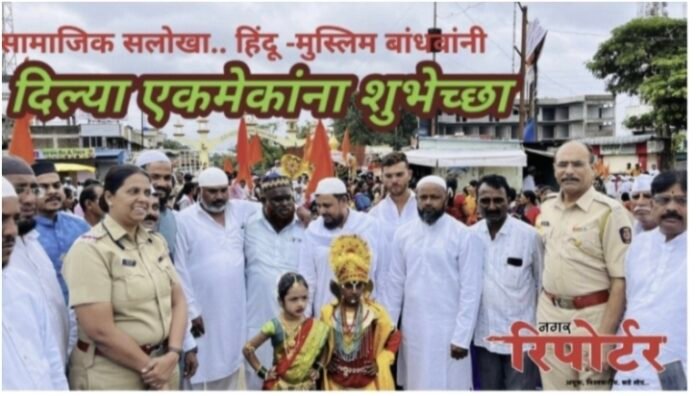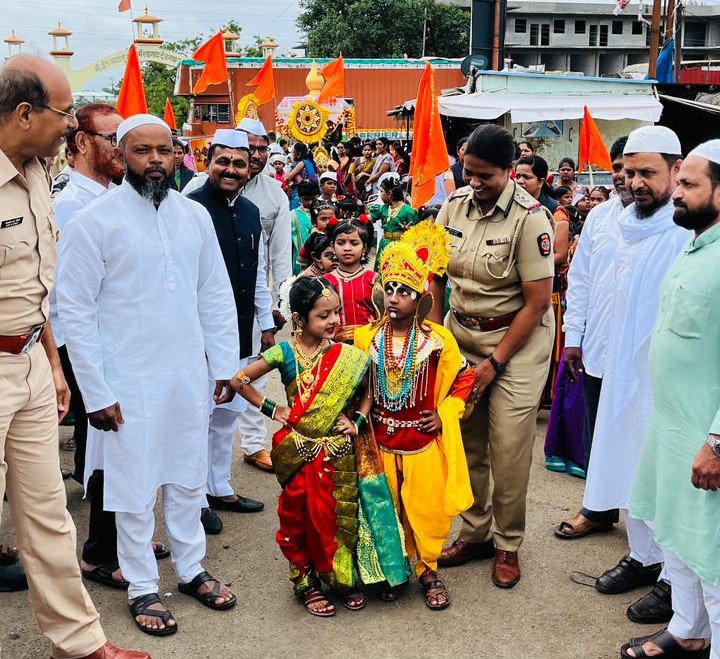 अहमदनगर : सामाजिक उपक्रमातून तसेच झालेल्या जनजागृतीचा प्रत्यय दिसून आला. तो असा जिल्ह्यातील सुपा या ठिकाणी हिंदू -मुस्लिम ऐक्याचे दर्शन घडले. बकरी ईदनिमित्त मस्जिदतून नमाज पठण केले, यानंतर थेट मुस्लिम बांधवांनी बसस्थानक चौकात जाऊन तेथे आलेल्या दिंडीतील विठ्ठल रूख्मिणी वेशभूषेतील बाल वारकऱ्यांचे स्वागत करीत सर्व हिंदू बांधवांची भेट घेतली. या दरम्यान आषाढी एकादशी व ईदनिमित्त एकमेकांना शुभेच्छा दिल्या. यावेळी नगर ग्रामीण डिवायएसपी संपतराव भोसले, सुपा पोलिस ठाण्याच्या पोनि ज्योती गडकरी यांच्यासह सुपा पोलिस ठाण्याचे पोलिस कर्मचारी उपस्थित होते.