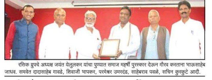 – रसिक ग्रुपचे अध्यक्ष जयंत येलुलकर यांना समाज महर्षी पुरस्कार देऊन नुकतेच सन्मानित करण्यात आले. भाऊसाहेब जाधव यांच्या अध्यक्षतेखाली झालेल्या या समारंभास दादासाहेब गावडे, शिवाजी भापकर, परमेश्वर उमरदंड, साहेबराव पवळे आदि उपस्थित होते. राष्ट्रसेवा परिषद संचलित मराठबोली या पुण्यातील संस्थेच्या अठराव्या वर्धापन दिनानिमित्त विविध क्षेत्रात उल्लेखनीय कार्य करणाऱ्यांना पुणे येथे समारंभात सन्मान प्रदान करून गौरविण्यात आले.