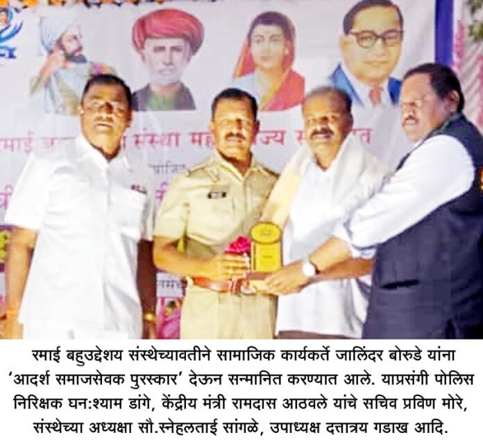 राहुरी येथील रमाई बहुउद्देशय संस्थेच्यावतीने सामाजिक कार्यकर्ते जालिंदर बोरुडे यांना ‘आदर्श समाजसेवक पुरस्कार’ देऊन सन्मानित करण्यात आले. याप्रसंगी पोलिस निरिक्षक श्री.डांगे, तहसिलदार फियोजिद्दीन शेख, केंद्रीय मंत्री रामदास आठवले यांचे सचिव प्रविण मोरे, संस्थेच्या अध्यक्षा सौ.स्नेहलताई सांगळे, उपाध्यक्ष दत्तात्रय गडाख आदि उपस्थित होते.