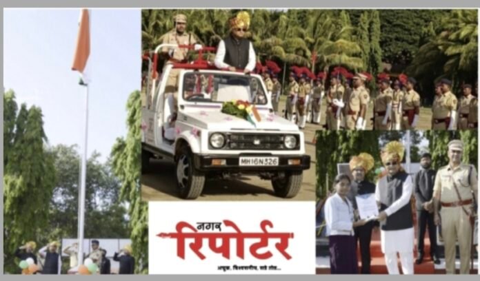 मुख्य शासकीय ध्वजारोहण समारंभात पालकमंत्र्यांच्या हस्ते जिल्हयातील शहीद जवान वीरपत्नी श्रीमती संगीता दिलीप गांगुर्डे (मु पो कोंभळी, तालुका कर्जत) माजी सैनिक आदिनाथ नामदेव धनवटे (मु. पो.भेर्डापूर ता. श्रीरामपूर) यांना शासनामार्फत ताम्रपट प्रदान करण्यात आले. पोलीस विभागातील उल्लेखनीय सेवेबद्दल अपर पोलीस अधीक्षक प्रशांत खैरे, पोलीस निरीक्षक विजय मारुती करे, पोलीस निरीक्षक मच्छिंद्र खाडे, पोलीस उपनिरीक्षक अण्णासाहेब बन्सी परदेशी, यांच्यासह चार पोलीस हवालदारांना पोलीस महासंचालक पदक देऊन यावेळी गौरवण्यात आले. २०२३ चा जिल्हा आदर्श तलाठी पुरस्कार, २0१३-१४ ते २०१९-२० या वर्षाचे पुण्यश्लोक अहिल्यादेवी होळकर पुरस्कार आणि २०२१ व २०२२ या वर्षाचे सूक्ष्म व लघू उद्योग घटकासाठी पुरस्कारांचे वितरण ही यावेळी करण्यात आले. महसूल विभागाच्या अनुकंपा धारकांच्या प्रतिक्षायादीतील गट-क उमेदवारांना तलाठी व महसूल सहायक संवर्गात अनुकंपा तत्वावर नियुक्तीपत्रे देण्यात आली. सरळसेवा भरतीत सन २०२१ अंतर्गत भूमी अभिलेख विभागातील भूकरमापक व राज्य उत्पादन शुल्क विभागातील दुय्यम निरीक्षक या पदासाठी अंतिम निवड झालेल्या उमेदवारांना नियुक्ती आदेश ही यावेळी देण्यात आले.