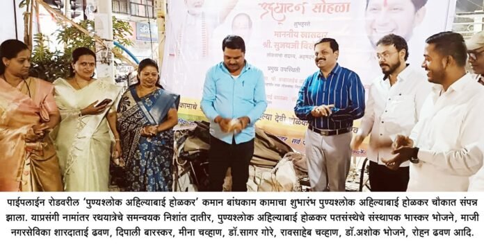 अहमदनगर – पुण्यश्लोक अहिल्यादेवीनगर नामांताराच्या ठरावानंतर जिल्ह्यातील नगरमधील पहिल्या पाईपलाईन रोडवरील ‘पुण्यश्लोक अहिल्याबाई होळकर’ कमान बांधकाम कामाचा शुभारंभ शुक्रवारी सायंकाळी पुण्यश्लोक अहिल्याबाई होळकर चौकात संपन्न झाला. याप्रसंगी नामांतर रथयात्रेचे समन्वयक निशांत दातीर, पुण्यश्लोक अहिल्याबाई होळकर पतसंस्थेचे संस्थापक भास्कर भोजने, माजी नगरसेविका शारदाताई ढवण, दिपाली बारस्कर, मीना चव्हाण, डॉ.सागर बोरुडे, रावसाहेब चव्हाण, डॉ.अशोक भोजने, रोहन ढवण, दत्ता हजारे, संदिप क्षीरसागर, ऋषी ढवण, सुभाष अबक, रविंद्र बारस्कर आदि उपस्थित होते.