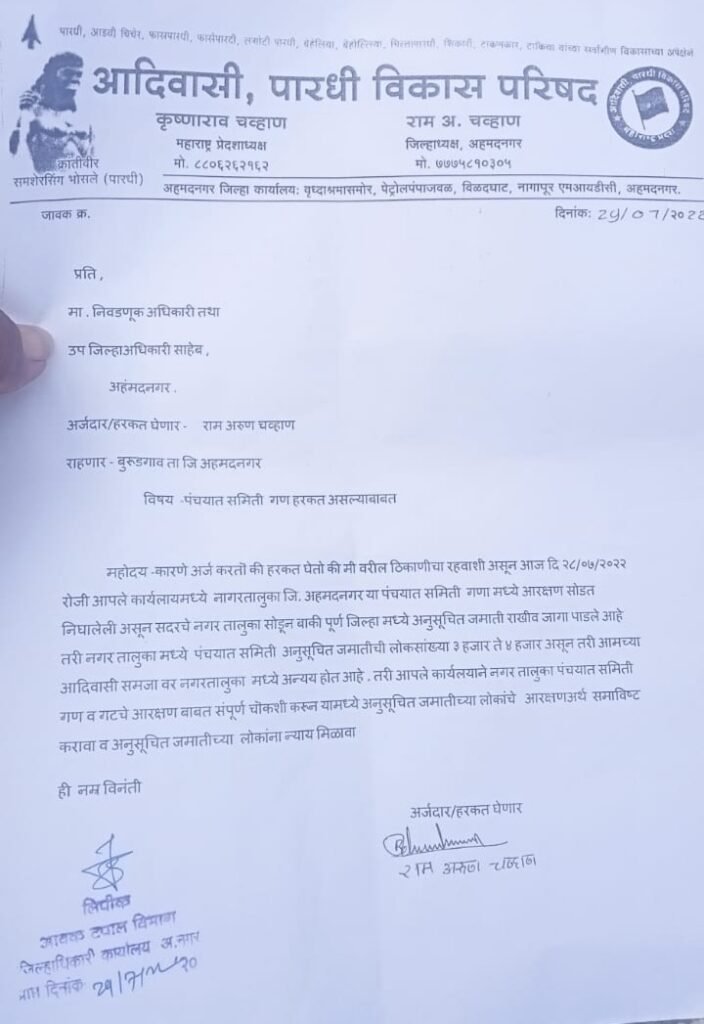आदिवासी, पारधी विकास परिषद जिल्हाध्यक्ष श्री चव्हाण यांनी  निवडणूक अधिकारी तथा उपजिल्हाअधिकारी यांच्याकडे केलेल्या हरकत अर्जामध्ये म्हटले की,  कार्यालयामध्ये नगर तालुका (जि. अहमदनगर) या पंचयात समिती गणामध्ये आरक्षण सोडत नुकतीच निघालेली आहे. नगर तालुका सोडून बाकी पूर्ण जिल्ह्यामध्ये अनुसूचित जमाती राखीव जागा पडल्या आहेत. नगर तालुकामध्ये पंचयात समिती अनुसूचित जमातीची लोकसंख्या ३ हजार ते ४ हजार आहे,  तरी आदिवासी समाजावर नगर तालुक्यामध्ये अन्याय होत आहे.  आपले कार्यालयाने नगर तालुका पंचयात समिती गण व गटचे आरक्षणबाबत संपूर्ण चौकशी करून यामध्ये अनुसूचित जमातीच्या लोकांचे आरक्षण समाविष्ट करावा व अनुसूचित जमातीच्या लोकांना न्याय मिळावा, अशी मागणी केली आहे.