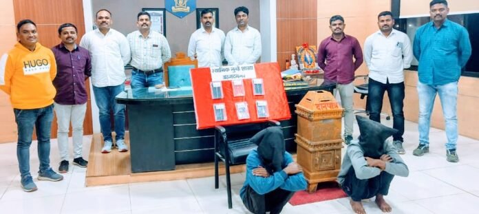 याबाबत समजलेली माहिती अशी की, दि.१ जानेवारी २०२४ रोजी अनोळखी इसमांनी औदुंबर चौक (नेवासा खु) येथील दुर्गादेवी मंदीराचे गेटचे कुलूप तोडून मंदिरात जाऊन ११ हजार रुपये किंमतीची दानपेटी व दान पेटीतील रोख रक्कम चोरुन नेली, या, पुजारी सुभाष एकनाथ चव्हाण ( रा. नेवासा खु, ता. नेवासा) यांनी दिलेल्या फिर्यादीवरून नेवासा पोलीस ठाण्यात गु.र.नं. ०२/२०२४ भादविक ४५७,३८० प्रमाणे घरफोडीचा गुन्हा दाखल करण्यात आला होता. हा दाखल गुन्ह्याचा समांतर तपास लावून उघडकीस आणण्याच्या एलसीबी टिम’ला वरिष्ठ पोलिस अधिकाऱ्यांनी आदेश दिले होते. त्यानुसार एलसीबी टिम’ने रेकॉर्डवरील गुन्हेगारांची माहिती घेत असताना एलसीबी पोनि दिनेश आहेर यांना माहिती मिळाली. त्यानुसार एलसीबी टिम’ने माहिती ठिकाणी जाऊन पाहाणी करता दोन संशयीत झाडाखाली बसलेले दिसले. पोलिसांची खात्री होताच दोन्ही संशयीतांना शिताफीने ताब्यात घेतले. त्यांना पोलीसांची ओळख सांगून त्यांचे नाव गांव विचारले असता त्यांनी त्यांचे नाव आकाश ऊर्फ मलिंगा कचरु जगधने (वय २२), व विशाल अरुण बर्डे (दोन्ही रा. गंगानगर, ता. नेवासा) असे असल्याचे सांगितले. त्यांच्याकडे गुन्ह्याच्या अनुषंगाने विचारपुस करता त्यांनी त्यांचे साथीदार फरार असणारे अमर बर्डे व बंटा ऊर्फ सौरभ (दोन्ही रा. गंगानगर, ता. नेवासा) यांचेसह गुन्हा केल्याची कबुली दिली. आरोपींची पंचासमक्ष अंगझडती घेता त्यांचे अंगझडतीमध्ये सोन्या चांदीचे दागिने, रोख व विविध कंपनीचे ४ मोबाईल फोन असा एकूण ५७ हजार ५०० रुपये किंमतीचा मुद्देमाल मिळून आला.