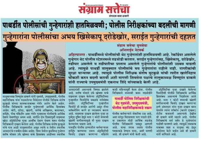 अहिल्यानगर ः पाथर्डीमध्ये पोलीसांची थेट गुन्हेगारांशी हातमिळवणी आहे. रेकॉर्डवर असलेले गुन्हेगार थेट पोलीस स्टेशनमध्ये तडजोडी करतात. सराईत गुन्हेगारांसह, खिसेकापू, दरोडेखोर, तडीपार असलेले व तडीपारीचा प्रस्ताव असलेले गुन्हेगारांचे पोलीसांशी उठबस वाढली आहे. त्यामुळे पाथर्डी तालुक्यात पोलीसांचे भय गुन्हेगारांना राहीले नाही. नागरीकांची सुरक्षा वार्यावर आहे. त्यामुळे पोलीस निरीक्षक संतोष मुटकुळे यांची त्वरीत खातेनिहाय चौकशी करुन बदली करावी अशी मागणी शिवसेना पक्षाचे तालुकाध्यक्ष विष्णूपंत ढाकणे यांनी राज्याचे उपमुख्यमंत्री एकनाथ शिंदे यांच्याकडे केली आहे.