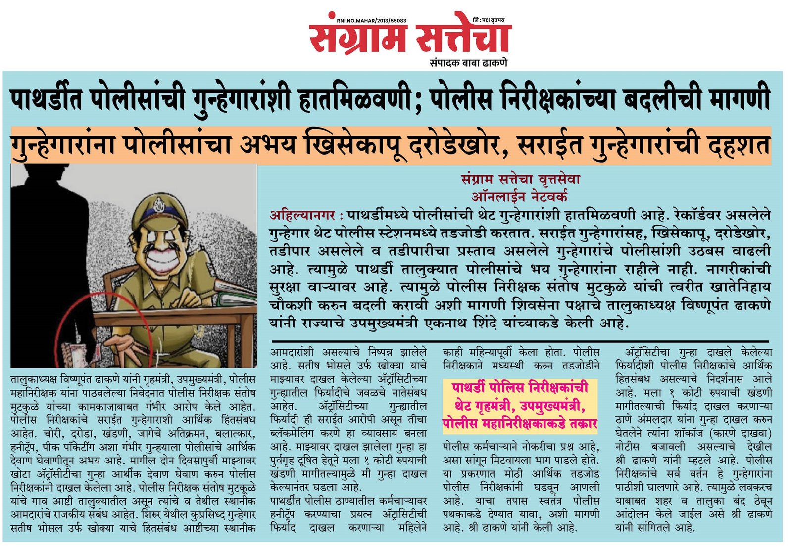 तालुकाध्यक्ष विष्णूपंत ढाकणे यांनी गृहमंत्री, उपमुख्यमंत्री, पोलीस महानिरीक्षक यांना पाठवलेल्या निवेदनात पोलीस निरीक्षक संतोष मुटकुळे यांच्या कामकाजाबाबत गंभीर आरोप केले आहेत. पोलीस निरीक्षकांचे सराईत गुन्हेगाराशी आथिर्र्क हितसंबध आहेत. चोरी, दरोडा, खंडणी, जागेचे अतिक्रमन, बलात्कार, हनीट्रॅप, पीक पॉकेटींग अशा गंभीर गुन्हयाला पोलीसांचे आर्थिक देवाण घेवाणीतून अभय आहे. मागील दोन दिवसापुर्वी माझ्यावर खोटा अॅट्रॉसीटीचा गुन्हा आर्थीक देवाण घेवाण करुन पोलीस निरीक्षकांनी दाखल केलेला आहे. पोलीस निरीक्षक संतोष मुटकूळे यांचे गाव आष्टी तालुक्यातील असून त्यांचे व तेथील स्थानीक आमदारांचे राजकीय संबंध आहेत. शिरुर येथील कुप्रसिध्द गुन्हेगार सतीष भोसल उर्फ खोक्या याचे हितसंबंध आष्टीच्या स्थानीक आमदारांशी असल्याचे निष्पन्न झालेले आहे. सतीष भोसले उर्फ खोक्या याचे माझ्यावर दाखल केलेल्या अॅट्रॉसिटीच्या गुन्ह्यातील फिर्यादीचे जवळचे नातेसंबध आहेत. अॅट्रॉसिटीच्या गुन्ह्यातील फिर्यादी ही सराईत आरोपी असून तीचा ब्लॅकमेलिंग करणे हा व्यावसाय बनला आहे. माझ्यावर दाखल झालेला गुन्हा हा पुर्वगृह दूषित हेतूने मला 1 कोटी रुपयाची खंडणी मागीतल्यामुळे मी गुन्हा दाखल केल्यानंतर घडला आहे.