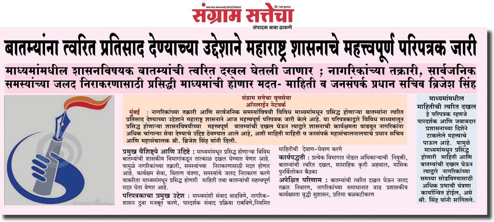 माध्यमांमधील माहितीची त्वरित दखल ः हे परिपत्रक म्हणजे पारदर्शक आणि जबाबदार प्रशासनाच्या दिशेने टाकलेले महत्त्वाचे पाऊल आहे. यामुळे माध्यमांमधून प्रसिद्ध होणारी माहिती आणि बातम्यांची दखल घेऊन त्याद्वारे नागरिकांच्या समस्या सोडविण्यासाठी अधिक प्रभावी यंत्रणा कार्यान्वित होईल, असे श्री. सिंह यांनी सांगितले.