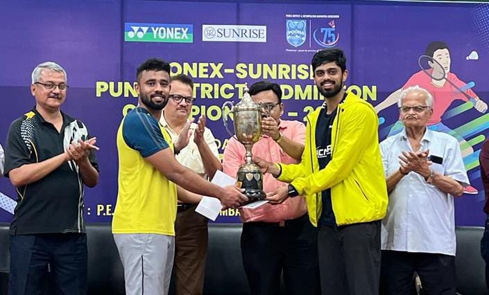 पुणे येथे संपन्न झालेल्या सिनियर गटाच्या बॅडमिंटन अजिंक्यपद स्पर्धेत प्रमुख पाहुण्यांच्या हस्ते दुहेरीचा पुणे जिल्ह्याचा बॅडमिंटन अजिक्यपदाचा मानाचा करंडक प्रमुख पाहुण्यांच्या हस्ते स्वीकारताना नरेंद्र गोगावले व यश शाह