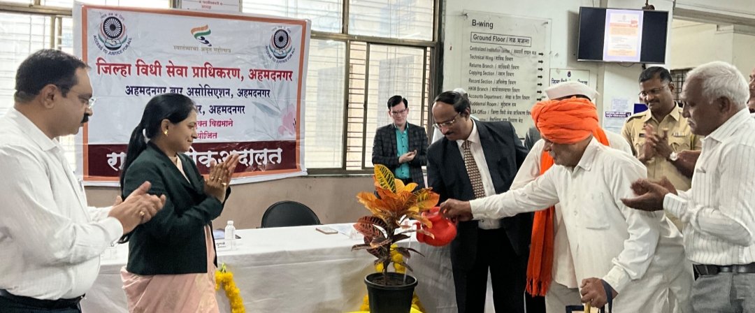 जिल्हा विधी सेवा प्राधिकरण, अहमदनगर बार असोसिएशन आणि सेंट्रल बार असोसिएशनतर्फे शनिवारी (दि. २७) रोजी आयोजित केलेल्या राष्ट्रीय लोक अदालतीचे उद्घाटन न्यायाधीश सुधाकर यार्लगड्डा यांच्या हस्ते झाले. याप्रसंगी निवासी उपजिल्हाधिकारी राजेंद्र पाटील, अतिरिक्त पोलिस अधीक्षक प्रशांत खैरे, जिल्हा सरकारी वकील सतीश पाटील, बार असोसिएशनचे अध्यक्ष नरेश गुगळे, पोलिस उपअधिक्षक हरीष खेडकर, अॅड. भूषण बर्हाटे, अॅड. विक्रम वाडेकर, अॅड. सागर पादीर, अॅड. राजाभाऊ शिर्के, अॅड. पिंटू पाटोळे, अॅड. अंधारे, जिल्हा विधी सेवा प्राधिकरण सचिव भाग्यश्री पाटील आदी उपस्थित होते.