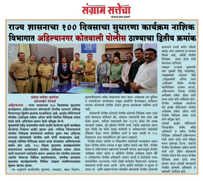 मुख्यमंत्री देवेंद्र फडणवीस यांनी जाहीर केलेल्या कृती कार्यक्रम योजनेचा निकाल जाहीर झाला आहे. नाशिक विभागामध्ये पोलीस निरीक्षक संवर्गामध्ये सर्वोत्तम दुसरा नंबर अहिल्या नगरच्या कोतवाली पोलीस ठाणे यांनी पटकावला आहे. त्यामुळे पोलिस निरीक्षक प्रताप दराडे यांच्यावर अभिनंदनाचा वर्षाव होत आहे. 100 दिवस सुधारणा कार्यक्रमांतर्गत करावयाच्या कामांबाबत पोलीस अधीक्षक राकेश ओला यांनी सातत्याने मार्गदर्शन करून आढावा घेत पोलीस दलाच्या अंतर्गत येणार्या विविध कार्यालयांना, पोलीस ठाण्यांना सुधारणा कार्यक्रमांतर्गत विविध उपक्रम राबविण्याबाबत सूचना केल्या होत्या. त्या अनुषंगाने कार्यालयीन सुधारणा, स्वच्छता, तक्रार निवारण, सुलभजीवनमान तसेच तंत्रज्ञानाचा वापर करून आवश्यक त्या सुविधा व उपाययोजना करणेबाबत उत्कृष्ट कामगिरी केल्याबद्दल उपविभाग स्तरावर कोतवाली पोलीस स्टेशन दुसर्या क्रमांकावर सर्वोत्तम ठरले आहे.