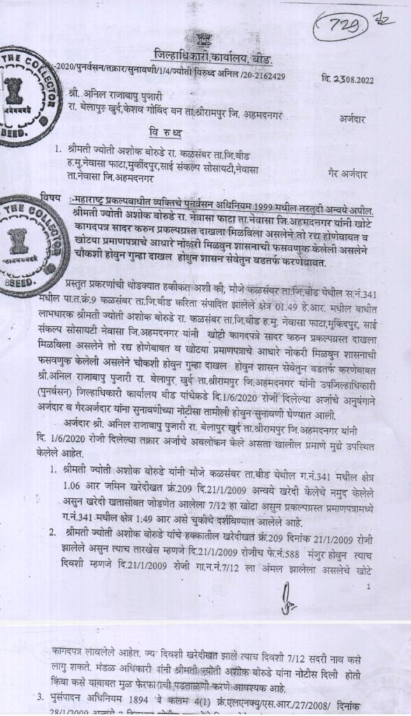 ज्योती अशोक बोरुडे (रा.कळसंबर ता.बीड, ह.मु. मुकिंदपूर नेवासा फाटा,ता.नेवासा जि.अहमदनगर) असे शिक्षिकेचे नाव आहे. त्यांनी प्रकल्पग्रस्ताचे बनावट प्रमाणपत्राआधारे अहमदनगर जिल्ह्यात नोकरी मिळवून शासनाची फसवणूक केली असल्याने तक्रारदार अनिल राजाबापू पुजारी (रा.बेलापूर खुर्द ता.श्रीरामपूर जि.अहमदनगर) यांनी याकामी बीड जिल्हाधिकारी यांच्याकडे दि. १ जून २०२० रोजी सखोल चौकशी आणि योग्य कार्यवाहीसाठी तक्रार दाखल करुन मागणी केली होती. त्यावर जिल्हाधिकारी बीड यांच्याकडे सुनावणी झाली, कळसंबर येथील गट क्र.३४१ मधील १.६ आर जमिनीचा ७/१२ उतारा अधारे प्रकल्पग्रस्ताचे बनावट प्रमाणपत्र काढण्यात आले असल्याचे ठोस पुरावे सादर करण्यात आले. तक्रारदार अनिल पुजारी यांनी केलेला पाठपुरावा व युक्तिवाद, विशेष भुसंपादन अधिकारी (जा.प्र.) व जिल्हा पुनर्वसन अधिकारी यांच्याकडील अभिलेख तसेच उप विभागीय अधिकाऱ्यांचा अहवाल ग्राह्य धरुन जिल्हाधिकारी राधाबिनोद शर्मा यांनी ज्योती बोरुडे यांचे प्रकल्पग्रस्त बनावट प्रमाणपत्र रद्द करण्याचे २३ ऑगस्ट २०२२ रोजी आदेश दिले आहेत.
