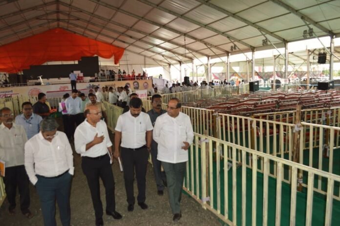 या बैठकीनंतर पालकमंत्री विखे पाटील यांनी कार्यक्रमस्थळाची पाहणी केली. सार्वजनिक बांधकाम विभागाच्या प्रमुख अधिकाऱ्यांशी कार्यक्रमासाठी तयार करण्यात येणारी मंडप व्यवस्था, विविध शासकीय कार्यालयांचे स्टॉल्स, लाभार्थ्यांच्या आसन व्यवस्था याबाबत चर्चा केली.