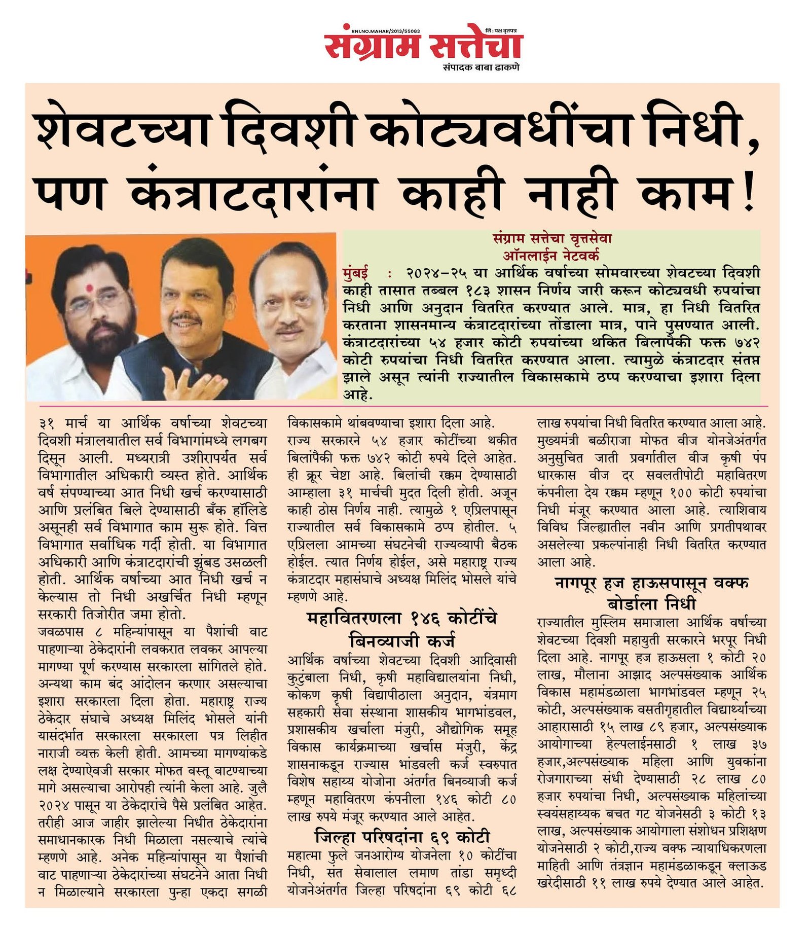 मुंबई ः 2024-25 या आर्थिक वर्षाच्या सोमवारच्या शेवटच्या दिवशी काही तासात तब्बल 183 शासन निर्णय जारी करून कोट्यवधी रुपयांचा निधी आणि अनुदान वितरित करण्यात आले. मात्र, हा निधी वितरित करताना शासनमान्य कंत्राटदारांच्या तोंडाला मात्र, पाने पुसण्यात आली. कंत्राटदारांच्या 54 हजार कोटी रुपयांच्या थकित बिलापैकी फक्त 742 कोटी रुपयांचा निधी वितरित करण्यात आला. त्यामुळे कंत्राटदार संतप्त झाले असून त्यांनी राज्यातील विकासकामे ठप्प करण्याचा इशारा दिला आहे.