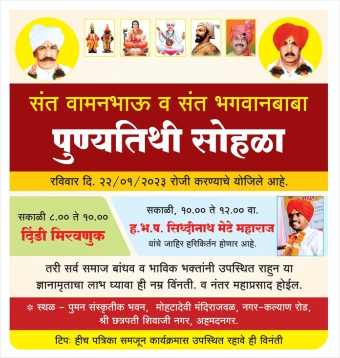 अहमदनगर – शहरातील कल्याणरोड वरील श्री छत्रपती शिवाजी महाराज नगर येथे मोहाटदेवी मंदिराजवळ पुनम सांस्कृतिक भवन या ठिकाणी श्री संत भगवानबाबा व श्री संत वामन भाऊ महाराज यांच्या पुण्यतिथीनिमित्ताने रविवारी (दि.२२) कार्यक्रमाचे आयोजन करण्यात आले आहे. या दरम्यान सकाळी ८ ते १० यावेळेत दिंडी मिरवणूक, सकाळी १० ते १२ यावेळेत सिद्धीनाथ मेटे महाराज यांचे कीर्तन होणार आहे., या कार्यक्रमासाठी भाविकांनी उपस्थित राहावे, असे आवाहन श्री संत भगवानबाबा व श्री संत वामनभाऊ पुण्यतिथी कमिटीने केले आहे.