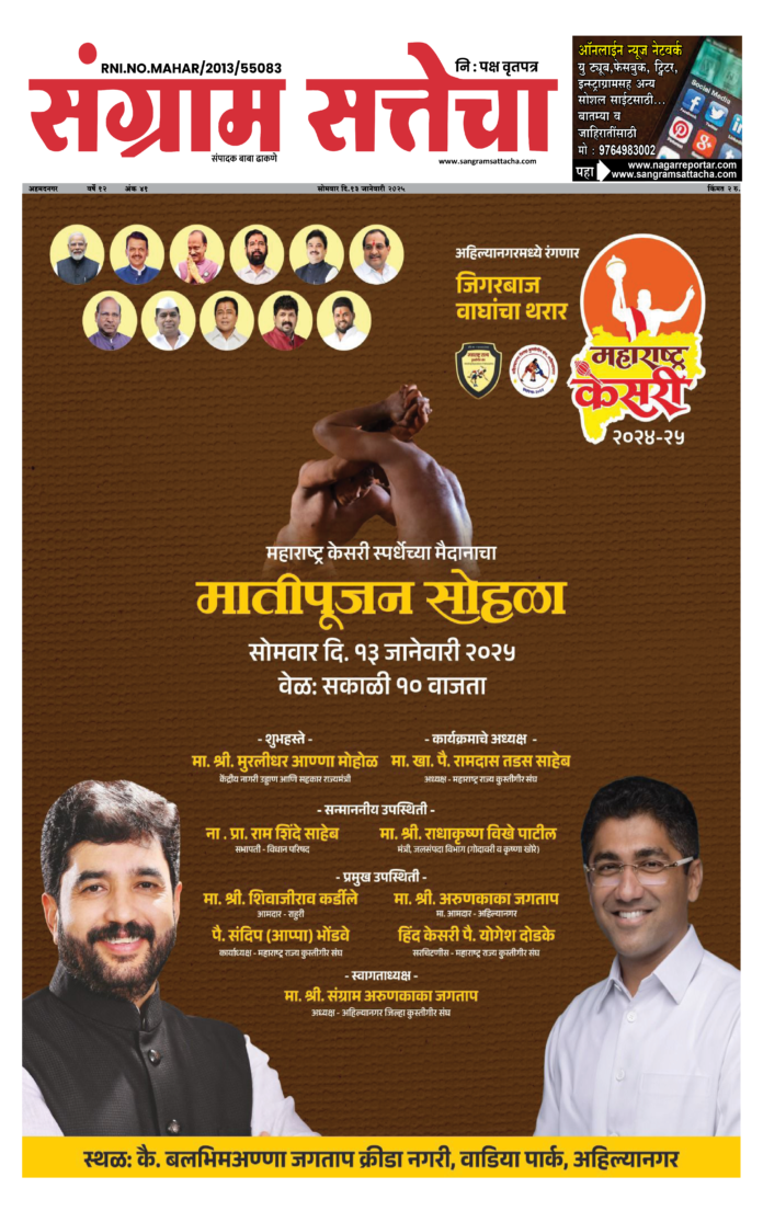 Homeअहमदनगर जिल्हा अहमदनगर जिल्हामहाराष्ट्रराजकारण संग्राम सत्तेचा वृत्तसेवा By baba dhakane 13/01/2025 0 97 WhatsAppFacebookTwitterTelegramPinterestLinkedinReddItTumblrDigg Share WhatsAppFacebookTwitterTelegramPinterestLinkedinReddItTumblrDigg Previous articleसरपंच देशमुखांच्या मारेकऱ्यांना फाशीची शिक्षा व्हावी ; अखिल भारतीय सरपंच महासंघाची मागणीNext articleअहिल्यानगरात महाराष्ट्र केसरी स्पर्धेच्या मैदानातील मातीपूजन सोहळा केंद्रीयमंत्री मुरलीधर मोहोळ यांच्या हस्ते baba dhakanehttps://sangramsattacha.in Related Articles महाराष्ट्र कोपरगावातील नरभक्षक बिबट्या अखेर ठार, 15 दिवसांत घेतलेला दोघांचा जीव अहमदनगर जिल्हा बुऱ्हाणनगर येथे माजीमंत्री आमदार शिवाजीराव कर्डिले यांचा शोकाकुल वातावरणात दशक्रियाविधी अहमदनगर जिल्हा मंत्री कोकाटेकडून कर्डीले कुटुंबीयांचे सांत्वन LEAVE A REPLY Cancel reply Comment: Please enter your comment! Name:* Please enter your name here Email:* You have entered an incorrect email address! Please enter your email address here Website: Save my name, email, and website in this browser for the next time I comment. Δ Stay Connected0FansLike3,912FollowersFollow22,800SubscribersSubscribe - Advertisement - Latest Articles महाराष्ट्र कोपरगावातील नरभक्षक बिबट्या अखेर ठार, 15 दिवसांत घेतलेला दोघांचा जीव अहमदनगर जिल्हा बुऱ्हाणनगर येथे माजीमंत्री आमदार शिवाजीराव कर्डिले यांचा शोकाकुल वातावरणात दशक्रियाविधी अहमदनगर जिल्हा मंत्री कोकाटेकडून कर्डीले कुटुंबीयांचे सांत्वन महाराष्ट्र केंद्रीय गृहमंत्री अमित शाह यांनी घेतले श्री साईबाबा समाधीचे दर्शन क्राईम Load more