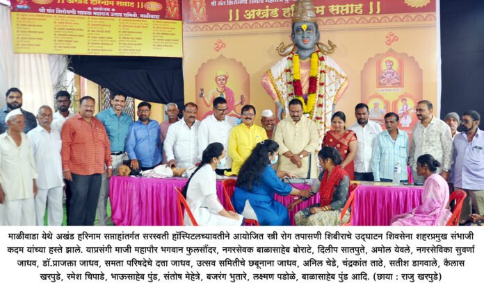 श्री संत सावता महाराज उत्सव समितीच्यावतीने माळीवाडा येथे अखंड हरिनाम सप्ताहांतर्गत सरस्वती हॉस्पिटलच्यावतीने आयोजित स्त्री रोग तपासणी शिबीराचे उद्घाटन शिवसेना शहरप्रमुख संभाजी कदम यांच्या हस्ते झाले. याप्रसंगी माजी महापौर भगवान फुलसौंदर, नगरसेवक बाळासाहेब बोराटे, दिलीप सातपुते, अमोल येवले, नगरसेविका सुवर्णा जाधव, डॉ.प्राजक्ता जाधव, समता परिषदेचे दत्ता जाधव, उत्सव समितीचे छबूनाना जाधव, अनिल चेडे, चंद्रकांत ताठे, सतीश डागवाले, कैलास खरपुडे, रमेश चिपाडे, भाऊसाहेब पुंड, संतोष मेहेत्रे, बजरंग भुतारे, लक्ष्मण पडोळे, बाळासाहेब पुंड आदि उपस्थित होते.