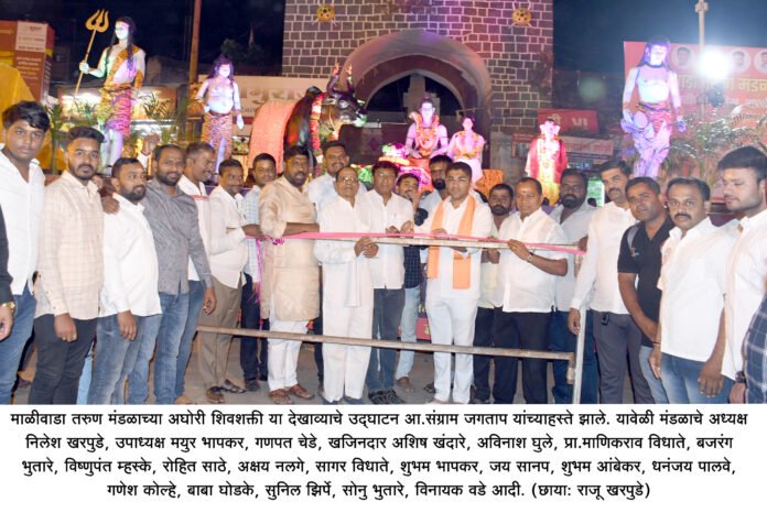 माळीवाडा तरुण मंडळाच्या अघोरी शिवशक्ती या देखाव्याचे उद्घाटन आ.संग्राम जगताप यांच्याहस्ते झाले. यावेळी मंडळाचे अध्यक्ष निलेश खरपुडे, उपाध्यक्ष मयुर भापकर, गणपत चेडे, खजिनदार अशिष खंदारे, अविनाश घुले, प्रा.माणिकराव विधाते, बजरंग भुतारे, विष्णुपंत म्हस्के, रोहित साठे, अक्षय नलगे, सागर विधाते, शुभम भापकर, जय सानप, शुभम आंबेकर, धनंजय पालवे, गणेश कोल्हे, बाबा घोडके, सुनिल झिर्पे, सोनु भुतारे, विनायक वडे आदींसह मंडळाचे पदाधिकारी उपस्थित होते.