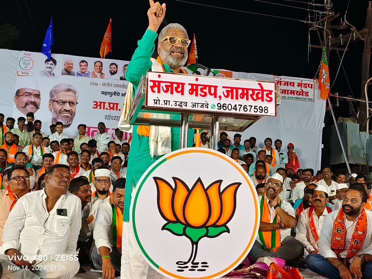 कर्जत जामखेड मतदारसंघातील महायुतीचे अधिकृत उमेदवार आमदार प्रा राम शिंदे यांच्या प्रचारासाठी आयोजित सभेत ते बोलत होते. यावेळी नरेंद्र पाटील, आमदार प्रा राम शिंदे, प्रा. मधुकर राळेभात, प्रा. सचिन गायवळ, अँड. कैलास शेवाळे, काकासाहेब तापकीर, राजेंद्र गुंड, अंबादास पिसाळ, कृषी उत्पन्न बाजार समितीचे सभापती शरद कार्ले, अजय काशिद, संजय काशिद, डॉ. भगवानराव मुरूमकर, सोमनाथ राळेभात, महेश निमोणकर, अमित चिंतामणी, पवन राळेभात, सचिन घुमरे, शिवसेना तालुकाप्रमुख प्रा. कैलास माने, सुनिल साळवे, संतोष गव्हाळे, प्रविण चोरडिया, रवी सुरवसे, मनोज कुलकर्णी, गफ्फार पठाण, शाकीर खान, जमीर बारूद, पोपट राळेभात यांच्या सह अनेक मान्यवर नेते व मोठ्या प्रमाणात महिला व नागरिक मोठ्या संख्येने उपस्थित होते.