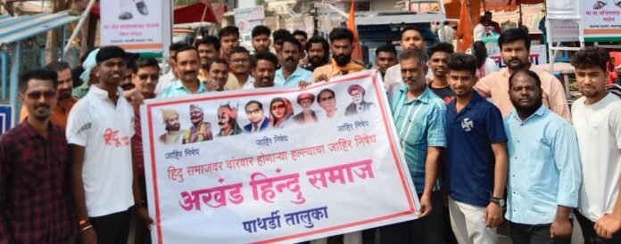 पाथर्डी : हिंदू समाजावर वारंवार होणाऱ्या हल्ल्याच्या निषेधार्थ व नगर शहरातील बजरंग दलाचे शहर संयोजक कुणालजी भंडारी व रामवाडी येथील अशोक लोंढे शेवगाव तालुक्यातील दहिगाव ने या गावातील अमोल जरे या हिंदू तरुणावर झालेल्या हल्ल्याच्या निषेधार्थ अखंड हिंदू समाज व विश्व हिंदू परिषद, बजरंग दल पाथर्डी प्रखंडच्या वतीने पोलीस निरीक्षक पाथर्डी यांना निवेदन देण्यात आले.