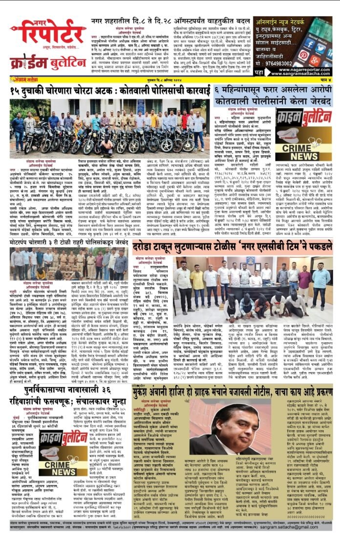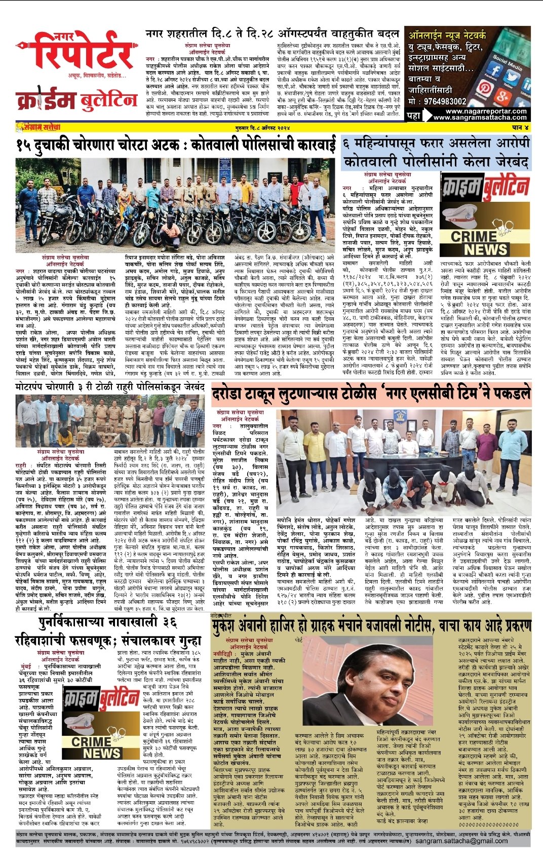 Homeक्राईम क्राईम By baba dhakane 09/08/2024 0 95 WhatsAppFacebookTwitterTelegramPinterestLinkedinReddItTumblrDigg Share WhatsAppFacebookTwitterTelegramPinterestLinkedinReddItTumblrDigg Previous articleश्री साई सच्यारित पारायण सोहळ्यात साडेसहा हजार भाविकांचा सहभागNext articleविशेष पोलिस महानिरिक्षक दत्तात्रय कराळे यांची श्री विशाल गणेश मंदिरास भेट baba dhakanehttps://sangramsattacha.in Related Articles महाराष्ट्र कोपरगावातील नरभक्षक बिबट्या अखेर ठार, 15 दिवसांत घेतलेला दोघांचा जीव अहमदनगर जिल्हा बुऱ्हाणनगर येथे माजीमंत्री आमदार शिवाजीराव कर्डिले यांचा शोकाकुल वातावरणात दशक्रियाविधी अहमदनगर जिल्हा मंत्री कोकाटेकडून कर्डीले कुटुंबीयांचे सांत्वन LEAVE A REPLY Cancel reply Comment: Please enter your comment! Name:* Please enter your name here Email:* You have entered an incorrect email address! Please enter your email address here Website: Save my name, email, and website in this browser for the next time I comment. Δ Stay Connected0FansLike3,912FollowersFollow22,800SubscribersSubscribe - Advertisement - Latest Articles महाराष्ट्र कोपरगावातील नरभक्षक बिबट्या अखेर ठार, 15 दिवसांत घेतलेला दोघांचा जीव अहमदनगर जिल्हा बुऱ्हाणनगर येथे माजीमंत्री आमदार शिवाजीराव कर्डिले यांचा शोकाकुल वातावरणात दशक्रियाविधी अहमदनगर जिल्हा मंत्री कोकाटेकडून कर्डीले कुटुंबीयांचे सांत्वन महाराष्ट्र केंद्रीय गृहमंत्री अमित शाह यांनी घेतले श्री साईबाबा समाधीचे दर्शन क्राईम Load more