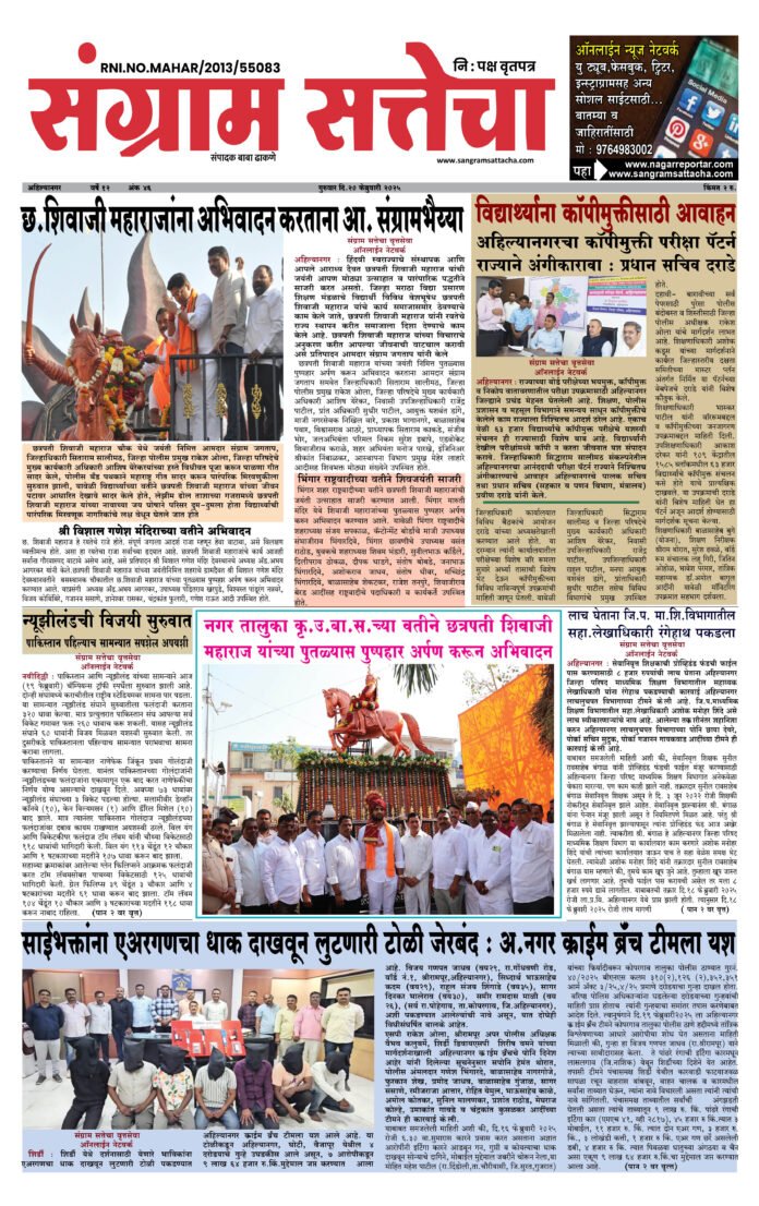 Homeअहमदनगर जिल्हा अहमदनगर जिल्हाआरोग्य-शिक्षण-महिलाक्राईम By baba dhakane 20/02/2025 0 103 WhatsAppFacebookTwitterTelegramPinterestLinkedinReddItTumblrDigg Anik-20 Faber 2025 – (Anik 46) 2 Share WhatsAppFacebookTwitterTelegramPinterestLinkedinReddItTumblrDigg Previous articleअहिल्यानगर शहरातील ५१ गुन्हेगारी पार्श्वभूमी असणा-यांना केले तडीपारNext articleतिसगावात वेश्याव्यवसाय करणाऱ्या लॉजिंगवर छापा baba dhakanehttps://sangramsattacha.in Related Articles महाराष्ट्र कोपरगावातील नरभक्षक बिबट्या अखेर ठार, 15 दिवसांत घेतलेला दोघांचा जीव अहमदनगर जिल्हा बुऱ्हाणनगर येथे माजीमंत्री आमदार शिवाजीराव कर्डिले यांचा शोकाकुल वातावरणात दशक्रियाविधी अहमदनगर जिल्हा मंत्री कोकाटेकडून कर्डीले कुटुंबीयांचे सांत्वन LEAVE A REPLY Cancel reply Comment: Please enter your comment! Name:* Please enter your name here Email:* You have entered an incorrect email address! Please enter your email address here Website: Save my name, email, and website in this browser for the next time I comment. Δ Stay Connected0FansLike3,912FollowersFollow22,800SubscribersSubscribe - Advertisement - Latest Articles महाराष्ट्र कोपरगावातील नरभक्षक बिबट्या अखेर ठार, 15 दिवसांत घेतलेला दोघांचा जीव अहमदनगर जिल्हा बुऱ्हाणनगर येथे माजीमंत्री आमदार शिवाजीराव कर्डिले यांचा शोकाकुल वातावरणात दशक्रियाविधी अहमदनगर जिल्हा मंत्री कोकाटेकडून कर्डीले कुटुंबीयांचे सांत्वन महाराष्ट्र केंद्रीय गृहमंत्री अमित शाह यांनी घेतले श्री साईबाबा समाधीचे दर्शन क्राईम Load more