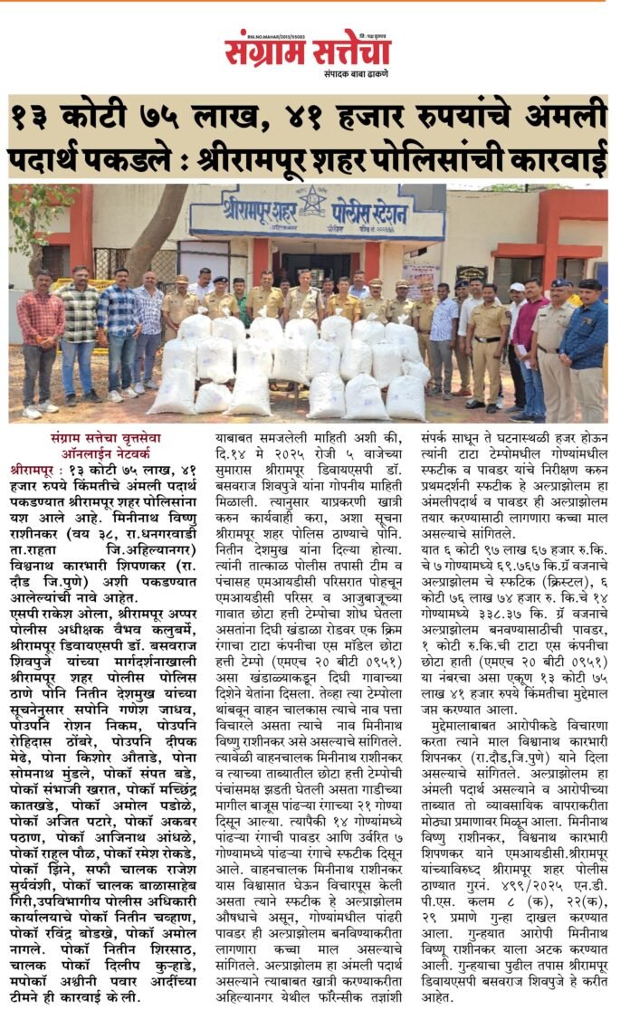 याबाबत समजलेली माहिती अशी की, दि.14 मे 2025 रोजी 5 वाजेच्या सुमारास श्रीरामपूर डिवायएसपी डॉ. बसवराज शिवपुजे यांना गोपनीय माहिती मिळाली. त्यानुसार याप्रकरणी खात्री करुन कार्यवाही करा, अशा सूचना श्रीरामपूर शहर पोलिस ठाण्याचे पोनि. नितीन देशमुख यांना दिल्या होत्या. त्यांनी तात्काळ पोलीस तपासी टीम व पंचासह एमआयडीसी परिसरात पोहचून एमआयडीसी परिसर व आजुबाजूच्या गावात छोटा हत्ती टेम्पोचा शोध घेतला असतांना दिघी खंडाळा रोडवर एक क्रिम रंगाचा टाटा कंपनीचा एस मॉडेल छोटा हत्ती टेम्पो (एमएच 20 बीटी 0951) असा खंडाळ्याकडून दिघी गावाच्या दिशेने येतांना दिसला. तेव्हा त्या टेम्पोला थांबवून वाहन चालकास त्याचे नाव पत्ता विचारले असता त्याचे नाव मिनीनाथ विष्णु राशीनकर असे असल्याचे सांगितले. त्यावेळी वाहनचालक मिनीनाथ राशीनकर व त्याच्या ताब्यातील छोटा हत्ती टेम्पोची पंचांसमक्ष झडती घेतली असता गाडीच्या मागील बाजूस पांढर्या रंगाच्या 21 गोण्या दिसून आल्या. त्यापैकी 14 गोण्यांमध्ये पांढर्या रंगाची पावडर आणि उर्वरित 7 गोण्यामध्ये पांढर्या रंगाचे स्फटीक दिसून आले. वाहनचालक मिनीनाथ राशीनकर यास विश्वासात घेऊन विचारपूस केली असता त्याने स्फटीक हे अल्प्राझोलम औषधाचे असून, गोण्यांमधील पांढरी पावडर ही अल्प्राझोलम बनविण्याकरीता लागणारा कच्चा माल असल्याचे सांगितले. अल्प्राझोलम हा अंमली पदार्थ असल्याने त्याबाबत खात्री करण्याकरीता अहिल्यानगर येथील फॉरेन्सीक तज्ञांशी संपर्क साधून ते घटनास्थळी हजर होऊन त्यांनी टाटा टेम्पोमधील गोण्यांमधील स्फटीक व पावडर यांचे निरीक्षण करुन प्रथमदर्शनी स्फटीक हे अल्प्राझोलम हा अंमलीपदार्थ व पावडर ही अल्प्राझोलम तयार करण्यासाठी लागणारा कच्चा माल असल्याचे सांगितले.