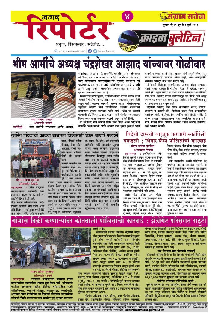 Homeक्राईम क्राईम Nagar Reporter By baba dhakane 29/06/2023 0 190 WhatsAppFacebookTwitterTelegramPinterestLinkedinReddItTumblrDigg Share WhatsAppFacebookTwitterTelegramPinterestLinkedinReddItTumblrDigg Previous articleसंग्राम सत्तेचाNext article.. जनजागृतीचा प्रत्यय, सुप्यात हिंदू -मुस्लिम ऐक्याचे दर्शन : आ. एकादशी व ईदनिमित्त एकमेकांना दिल्या शुभेच्छा baba dhakanehttps://sangramsattacha.in Related Articles महाराष्ट्र कोपरगावातील नरभक्षक बिबट्या अखेर ठार, 15 दिवसांत घेतलेला दोघांचा जीव अहमदनगर जिल्हा बुऱ्हाणनगर येथे माजीमंत्री आमदार शिवाजीराव कर्डिले यांचा शोकाकुल वातावरणात दशक्रियाविधी अहमदनगर जिल्हा मंत्री कोकाटेकडून कर्डीले कुटुंबीयांचे सांत्वन LEAVE A REPLY Cancel reply Comment: Please enter your comment! Name:* Please enter your name here Email:* You have entered an incorrect email address! Please enter your email address here Website: Save my name, email, and website in this browser for the next time I comment. Δ Stay Connected0FansLike3,912FollowersFollow22,800SubscribersSubscribe - Advertisement - Latest Articles महाराष्ट्र कोपरगावातील नरभक्षक बिबट्या अखेर ठार, 15 दिवसांत घेतलेला दोघांचा जीव अहमदनगर जिल्हा बुऱ्हाणनगर येथे माजीमंत्री आमदार शिवाजीराव कर्डिले यांचा शोकाकुल वातावरणात दशक्रियाविधी अहमदनगर जिल्हा मंत्री कोकाटेकडून कर्डीले कुटुंबीयांचे सांत्वन महाराष्ट्र केंद्रीय गृहमंत्री अमित शाह यांनी घेतले श्री साईबाबा समाधीचे दर्शन क्राईम Load more